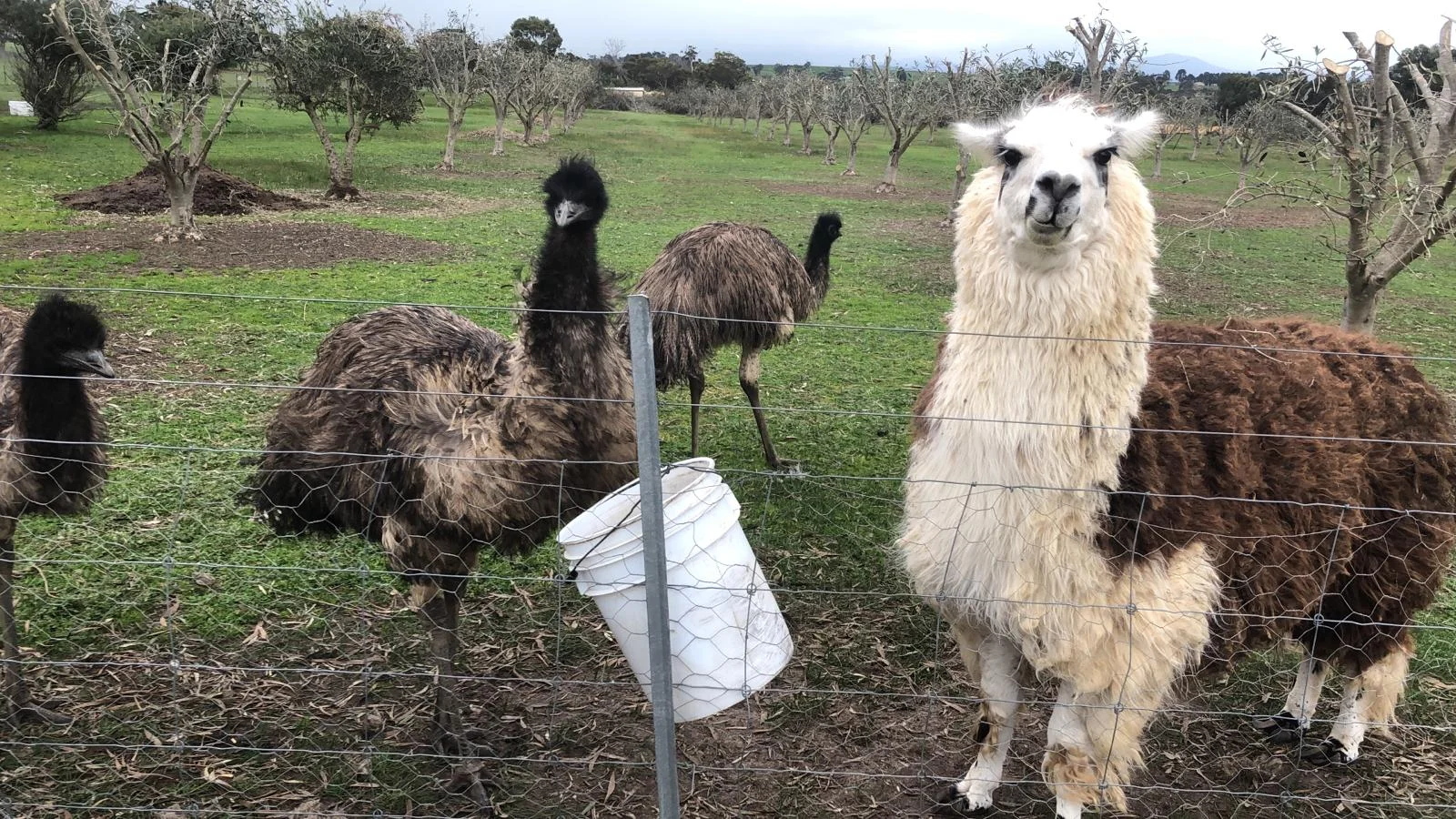 Stroll through the olive grove that is home to a flock of black Indian runner ducks and a flock of geese.